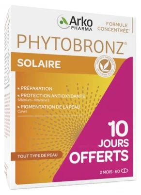 Arkopharma Phytobronz 60 Capsules of which 10 Capsules Free is a food supplement that combines a mixture of active ingredients, including 100% plant-based carotenoids, copper and selenium for: