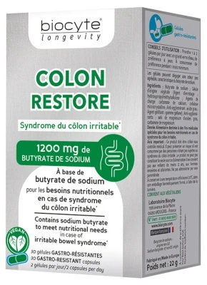 Biocyte Longevity Colon Restore 30 Capsules is a food supplement in the form of gastro-resistant capsules based on sodium butyrate for the nutritional needs in case of irritable bowel syndrome.