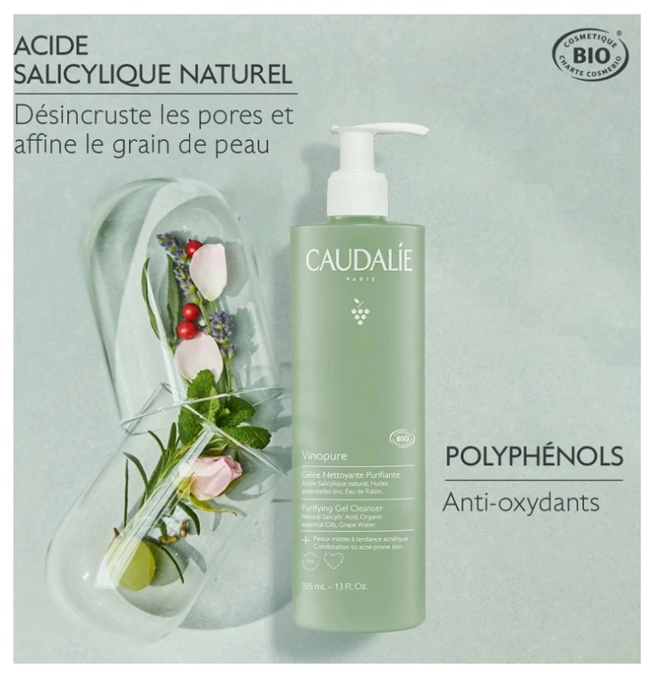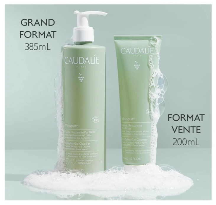 Caudalie Vinopure Purifying Gel Cleanser Organic 385ml is a purifying cleansing gel for combination skin with an acneic tendency, based on natural salicylic acid, organic essential oils and grape water that cleanses and tightens pores.