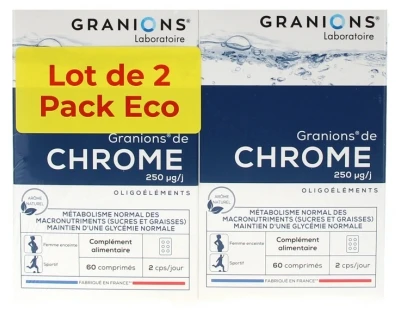 Granions Chromium 250µg 2 x 60 Tablets is a food supplement with natural orange flavour and based on Chromium, an essential trace-element for macro-nutrient metabolism (carbohydrates and lipids).