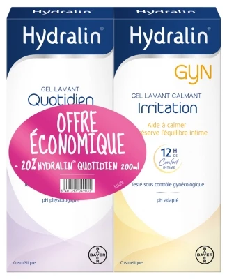 Hydralin Gyn Irritation Calming Cleansing Gel 200ml + Daily Cleansing Gel 200ml 20% off is a duo of treatments indicated for the hygiene of the intimate area that can be altered or weakened by hormonal changes or imbalances.
