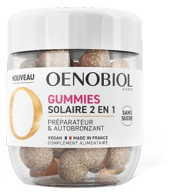 Oenobiol Sun 2in1 60 Gummies is a preparatory and self-tanning food supplement, which offers a triple solar action: optimal preparation of the skin before exposure to the sun, antioxidant cellular protection and allows a progressive tan.Its formula is a concentrate of nutrients and extracts of plant origin: