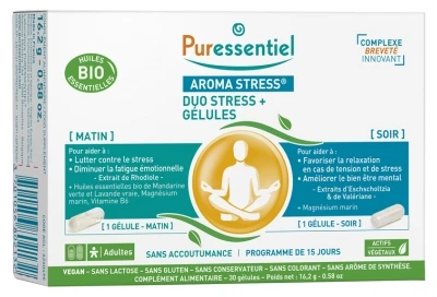 Puressentiel Aroma Stress Duo Stress + Capsules 30 Capsules is a food supplement divided into one capsule for the morning and one capsule for the evening.
