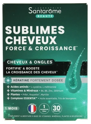 Santarome Sublime Hair Strength & Growth 30 Tablets is a dietary supplement designed to fortify and boost hair and nail growth.