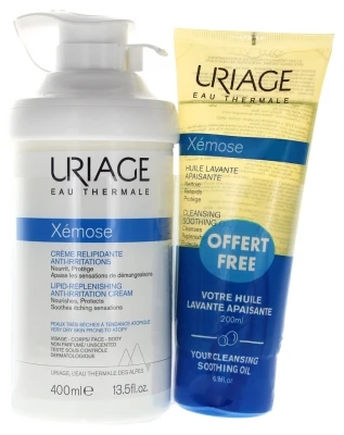 Uriage Xémose Lipid Replenishing Anti-Irritation Cream 400ml + Cleansing Soothing Oil 200ml Free is a face and body duo cares, intended to protect the dry skins with atopic tendency of the whole family: