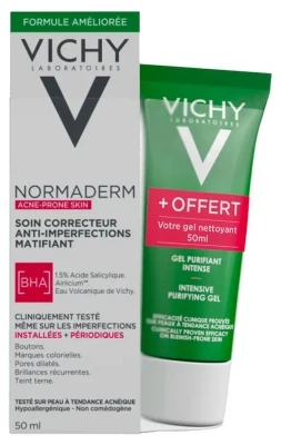 – Vichy Normaderm Deep Cleansing Purifying Gel 50ml unblocks skin pores, cleans and unclogs them in-depth. Its gel-texture is ultra fresh. Its creamy and abundant foam is very easy to rinse. Non-comedogenic, tested on sensitives skins prone to acne.